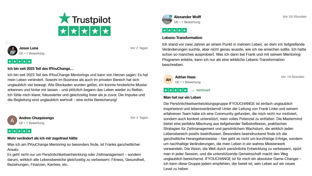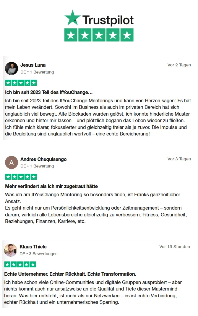 ⭐️⭐️⭐️⭐️⭐️Frank Linke, Gründer der IfYouChange Mastermind, ist ein erfolgreicher Unternehmer und Experte für Persönlichkeitsentwicklung. Für Geld müsste er nie wieder arbeiten. Er lebt seine selbst-verursachte absolute persönliche Freiheit durch minimale feste Termine, Immobilien an dem schönsten Ort der Welt und mentale Freiheit durch seine diversen Ausbildungen und Coaching-Erfahrungen.